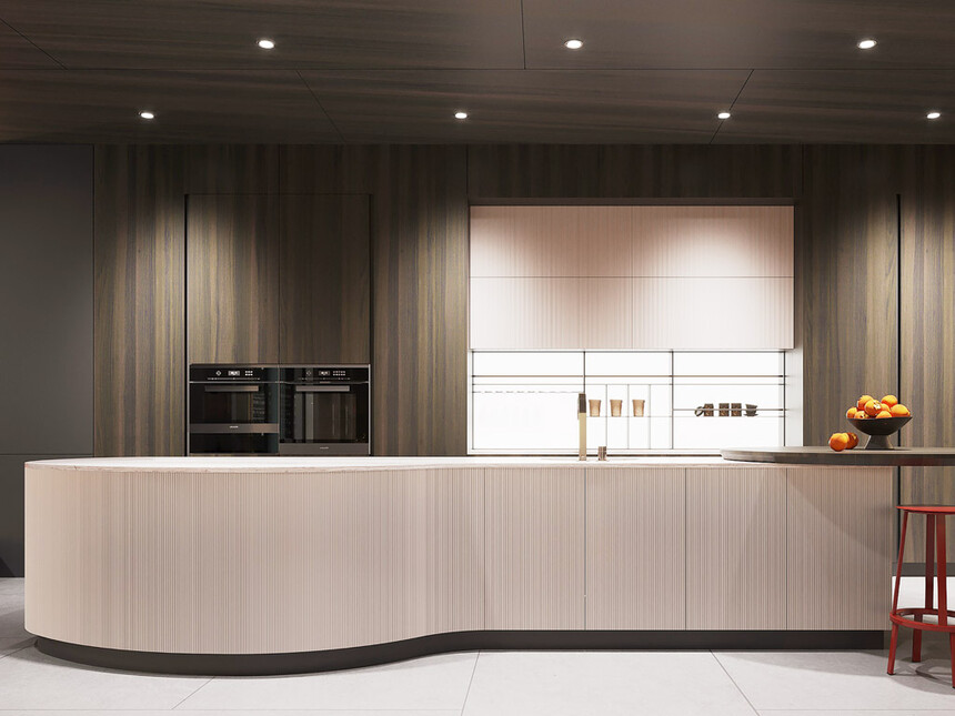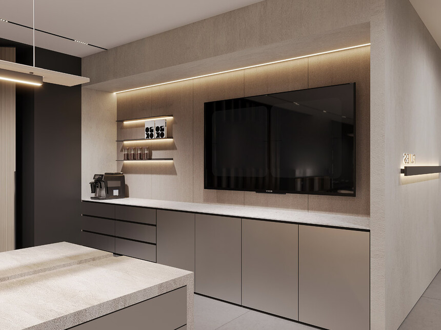 隐藏式收纳柜,让锅碗瓢盆各归其位,台面始终保持整洁;嵌入式灯光从柜体底部漫出,照亮操作台面的同时,也为空间增添了柔和氛围。在这里,切菜、烹饪不再是琐碎的家务,而是在简约美学空间里,与生活节奏精准契合的舒适体验——高效与颜值并存,这才是理想厨房的模样。