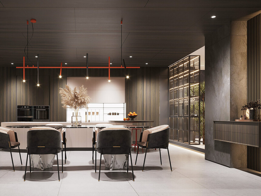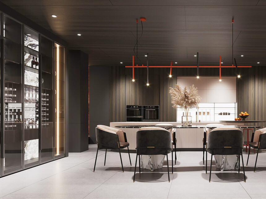意式极简餐厅,用克制的设计承载最鲜活的生活气息。浅灰色岩板餐桌搭配纤细金属椅,轻盈却不失质感。一盏悬浮式吊灯落下暖光,当食物上桌,光影与食材碰撞,简约空间里,每一顿饭都成了一场优雅的仪式。