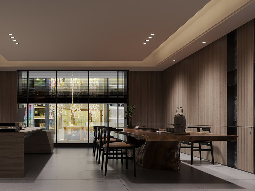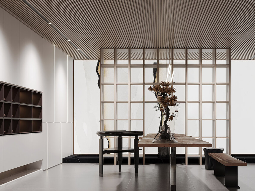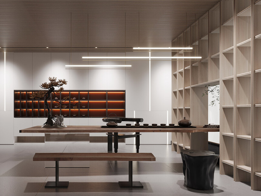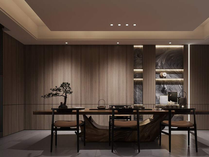 当意式极简遇见东方茶韵,便有了这份克制的雅致。胡桃色墙板搭配胡桃色茶桌,线条干净却自带温润感;嵌入式储物柜藏起茶具杂物,仅在桌面摆放一套素雅茶器。没有多余的修饰,却让每一次品茶,都成为一场静心的修行。