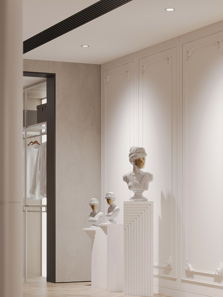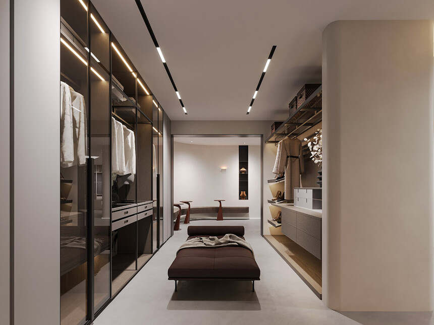 意式极简衣帽间,用“秩序感”诠释精致生活。顶天立地的定制柜体,分区明确的挂杆、抽屉与隔板,每一件衣物都能找到专属位置;开放式的设计,让空间更显整洁。